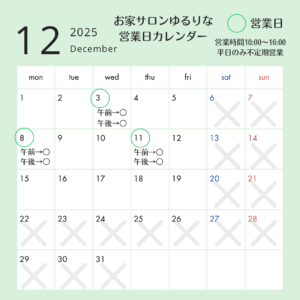 2025年、皆さまにとってどんな一年でしたか? 私は2025年の1月からプチ起業サポートを受けながら、少しずつお家サロンの準備を始め、10月に「お家サロンゆるりな」をオープンすることができました。 プレオープンでは5名の […]