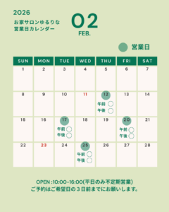 お家サロンゆるりな2月の営業日のお知らせです🌿 2月も平日のみ不定期のんびり営業ですがよろしくお願いします。 【ご予約状況】2月12日(木)午前(○)・午後(○)2月17日(火)午前(○)・午後(○)2月20日(金)午前 […]